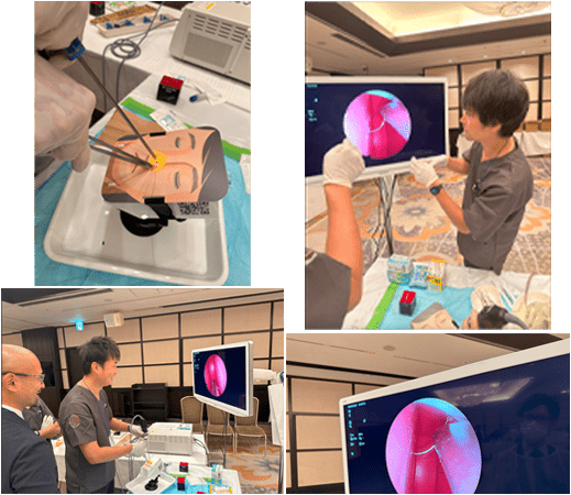ESS practice model(PJ Wormald sinus モデル)を用いて片側ESSの実践的基本手技を行います。鉗子操作、マイクロデブリッダーの操作もほぼ生体に近い感覚でトレーニングができます。特にESSを始めた専攻医の方々は非常に有益だと思います。